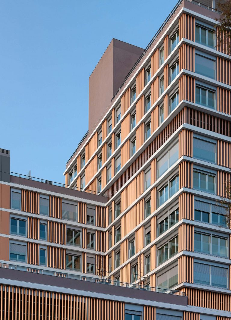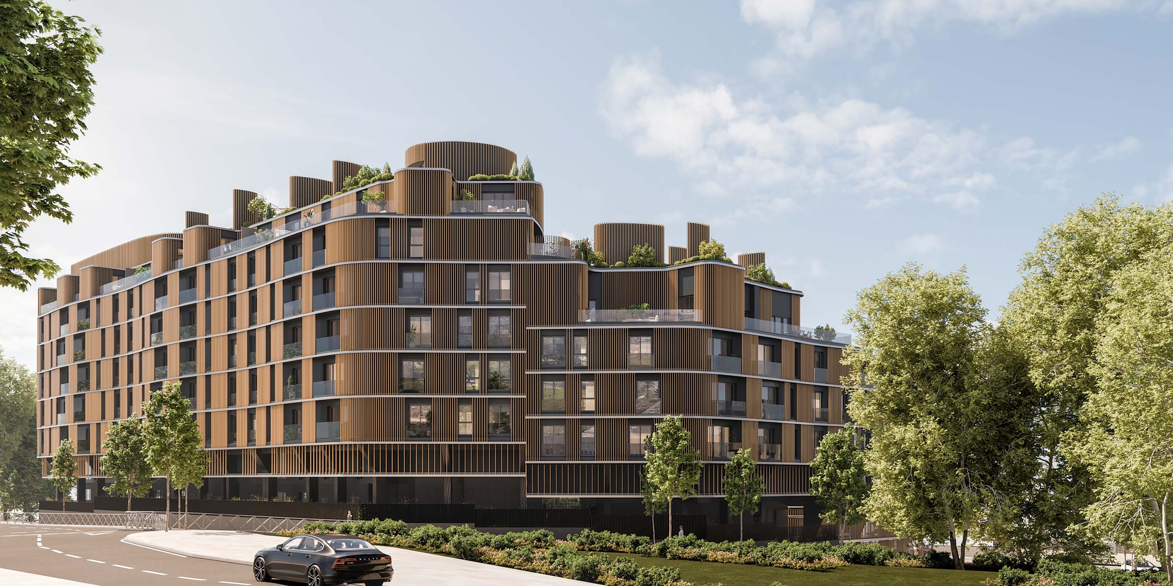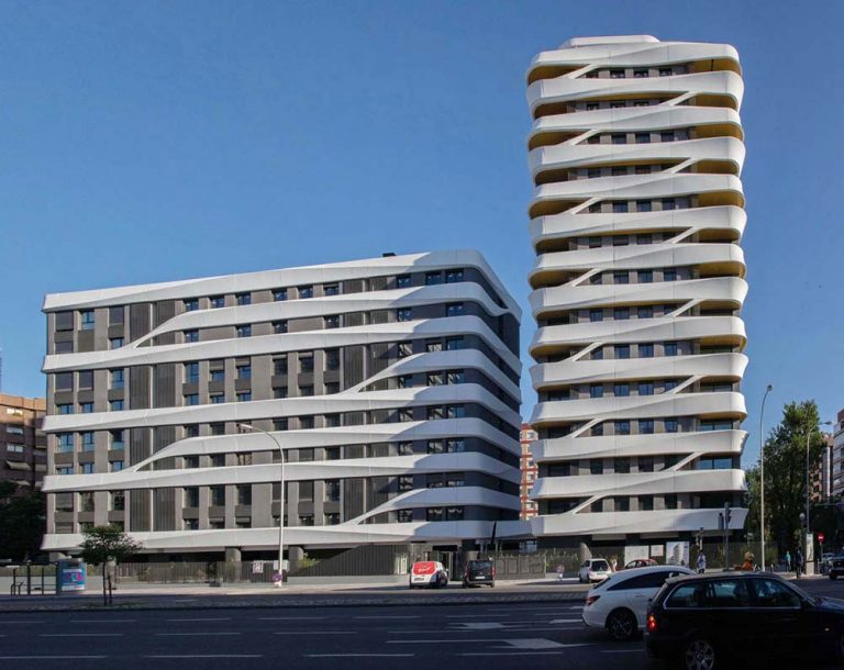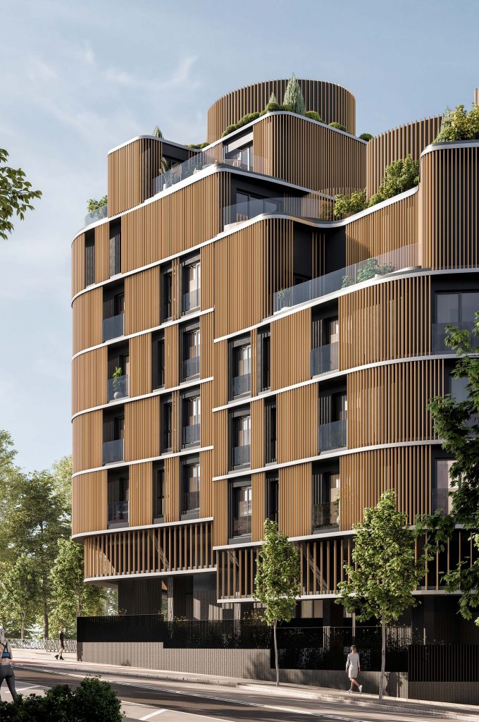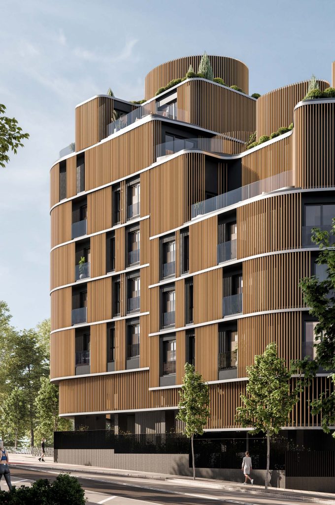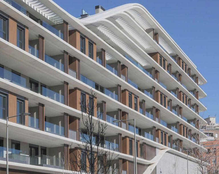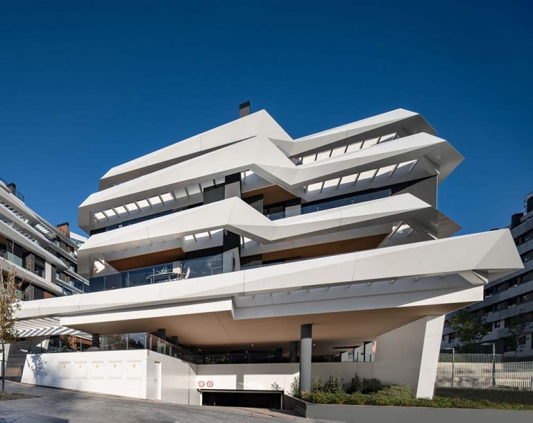 Este edificio combina lo exclusividad y diseño a partes iguales. Sus formas suaves, los materiales seleccionados y la conexión con el entorno crean un edificio vanguardista.